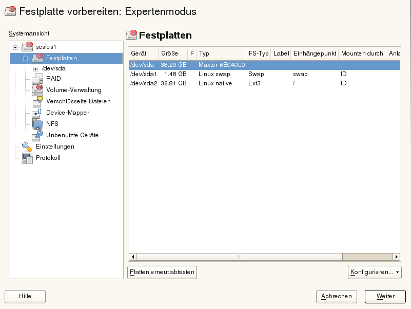 Alle bestehenden oder vorgeschlagenen Partitionen auf allen angeschlossenen Festplatten werden in der Liste im YaST-Dialogfeld angezeigt. Ganze Festplatten werden als Geräte ohne Nummern aufgeführt, beispielsweise als /dev/sda (oder /dev/dasda). Partitionen werden als Teile dieser Geräte aufgelistet, beispielsweise als /dev/sda1 (oder /dev/dasda1). Größe, Typ, Dateisystem und Einhängepunkt der Festplatten und ihrer Partitionen werden ebenfalls angezeigt. Der Einhängepunkt gibt an, wo sich die Partition im Linux-Dateisystembaum befindet.
