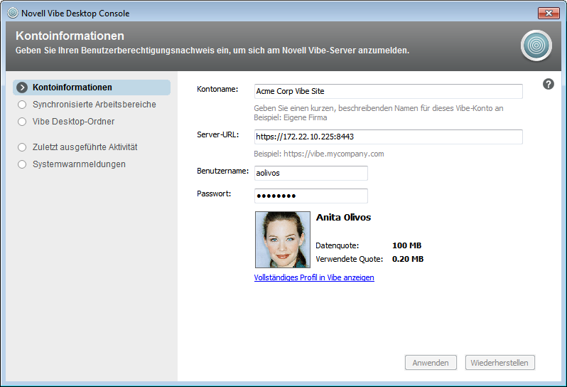 Bei der erstmaligen Konfiguration von Vibe Desktop geben Sie Ihre Kontoinformationen und Informationen zum Vibe-Server an. Die Informationen zum Vibe Desktop-Konto und zum Vibe-Server können jederzeit nach der ursprünglichen Konfiguration geändert werden: