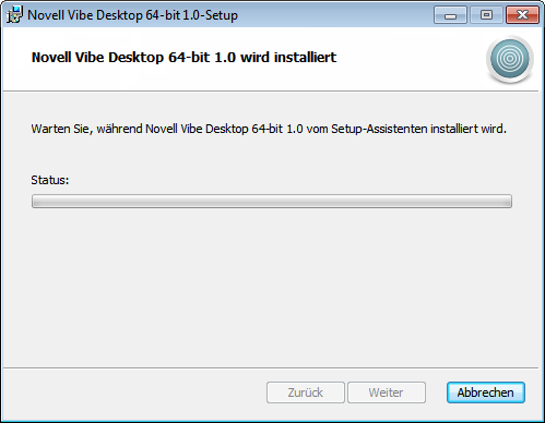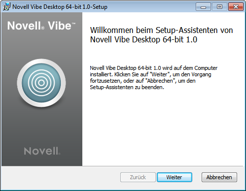 Führen Sie die heruntergeladene Datei NovellVibeDesktop-x86-Version.msi bzw. NovellVibeDesktop-x64-Version.msi aus, abhängig davon, ob Sie ein 32-Bit- oder ein 64-Bit-Betriebssystem verwenden.
