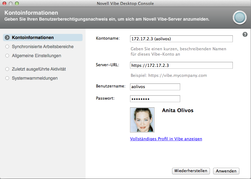 Bei der erstmaligen Konfiguration von Vibe Desktop geben Sie Ihre Kontoinformationen und Informationen zum Vibe-Server an. Die Informationen zum Vibe Desktop-Konto und zum Vibe-Server können jederzeit nach der ursprünglichen Konfiguration geändert werden: