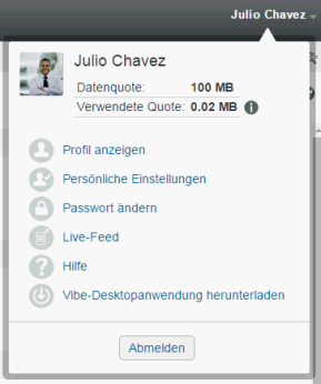 HINWEIS:Wenn Sie Ihre persönlichen Informationen (z. B. Ihr Vibe-Passwort) nicht wie in diesem Abschnitt beschrieben ändern können, liegt dies wahrscheinlich daran, dass Ihre persönlichen Daten gerade von einem externen Verzeichnisserver synchronisiert werden. Um Änderungen vornehmen zu können, müssen Sie den zuständigen Vibe-Administrator zurate ziehen.