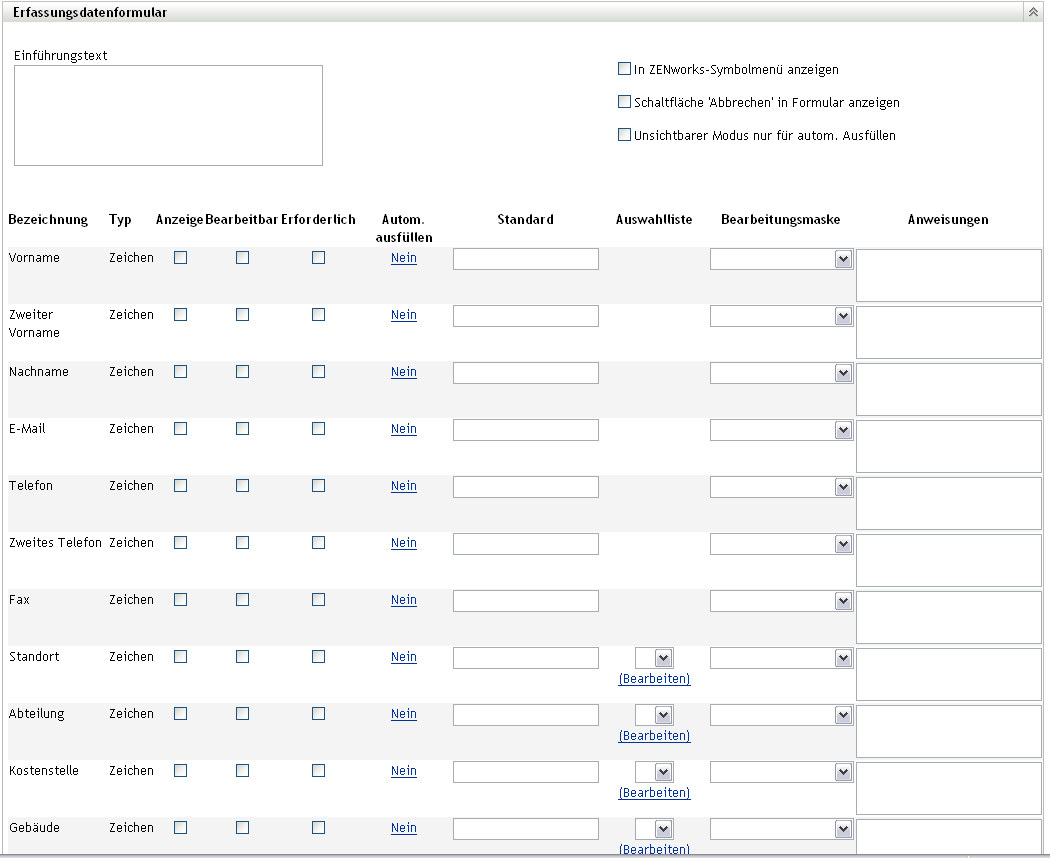 Beim Konfigurieren des Erfassungsdatenformulars geben Sie an, welche Informationen vom jeweiligen Arbeitsstations-Benutzer erfasst werden sollen. Das Formular zur Datenerfassung ist nicht standardmäßig konfiguriert. Es muss vor der Bereitstellung erst konfiguriert werden.