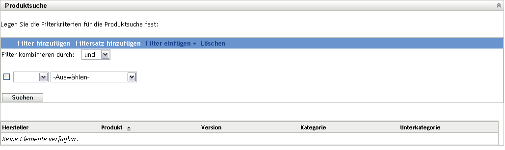 Im Bereich "Produktsuche" können Sie Filter und Filtersätze zur Suche nach einem bestimmten Produkt auswählen. Das jeweilige Produkt wird dann zusätzlich zu folgenden Informationen angezeigt: