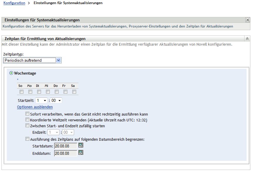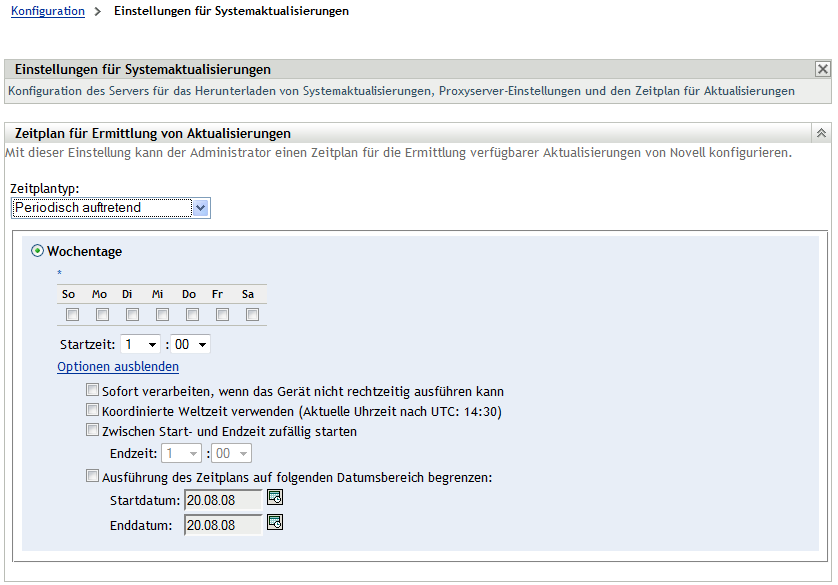 Sie können angeben, wie häufig die Ermittlung von Aktualisierungen erfolgen soll. Wenn Sie einen Zeitplan angeben, werden die Informationen zu den verfügbaren Aktualisierungen automatisch von Novell auf die Kontrollleiste "Verfügbare Systemaktualisierungen" der Registerkarte heruntergeladen, sobald die Zeitplanaktion ausgelöst wird. Damit wird nicht der eigentliche Aktualisierungsinhalt heruntergeladen. Der Download-Zeitplan kann in der Kontrollleiste "Zeitplan für Herunterladen" festgelegt werden (siehe Zeitplan für Herunterladen).