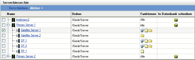 Wenn auf einem Satelliten Rollen aktiviert sind, werden deren Symbole in der Spalte der Kontrollleiste "Serverhierarchie" angezeigt.