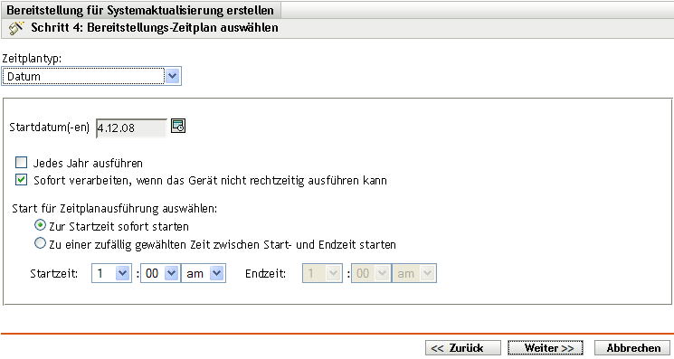 Datum: Die Aktualisierung wird gemäß Zeitplan bereitgestellt. Für die Option werden folgende weitere Optionen angezeigt:
