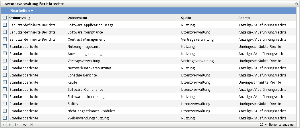 Mithilfe von ZENworks® Asset Management können Sie Administratorrechte für jeden Berichtordner verwalten. Die mit jedem Ordner verknüpften Rechte regeln alle Berichte in diesem Ordner. Wenn Sie beispielsweise volle Rechte für einen Ordner haben, können Sie Berichte in diesem Ordner bearbeiten; mit Anzeige-/Ausführungsrechten können Sie nur die Berichte des Ordners anzeigen und sie ausführen.