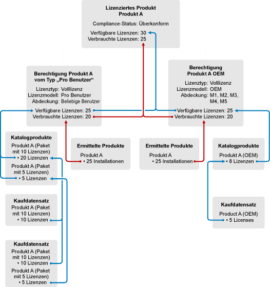 Lizenziertes Produkt: Unter einem lizenzierten Produkt versteht man das Softwareprodukt, dessen Compliance-Status überwacht werden soll. Die zur Feststellung des Compliance-Status erforderlichen Informationen (Berechtigungen, Installationen und gekaufte Lizenzen) finden Sie in den Komponenten des lizenzierten Produkts (Berechtigungen, ermittelte Produkte, Katalogprodukte und Kaufdatensätze).