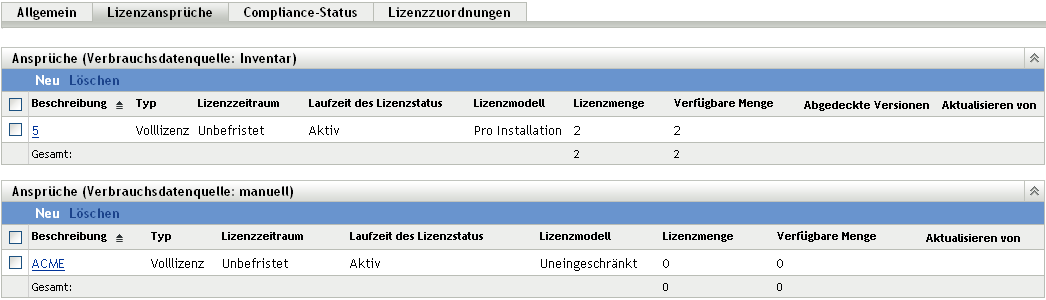 wird die Kaufmenge der einzelnen Katalogprodukte angezeigt, also die Anzahl der Einheiten der Katalogprodukte, die Sie (gemäß den Kaufdatensätzen) gekauft haben. Dort wird auch die Lizenzmenge angezeigt, also die Gesamtanzahl der Lizenzen, die in den gekauften Einheiten enthalten sind.