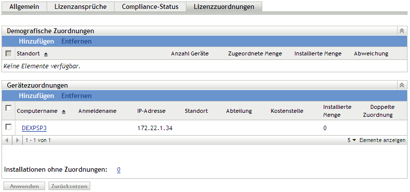 Sie können die Lizenzen eines Produkts Standorten, Abteilungen oder Kostenstellen zuordnen. Der demografische Wert (zum Beispiel Standort1, AbteilungQ oder Kostenstelle123) muss bereits als Wert in Ihren Inventargerätedaten oder Kaufdatensatzdaten vorhanden sein.