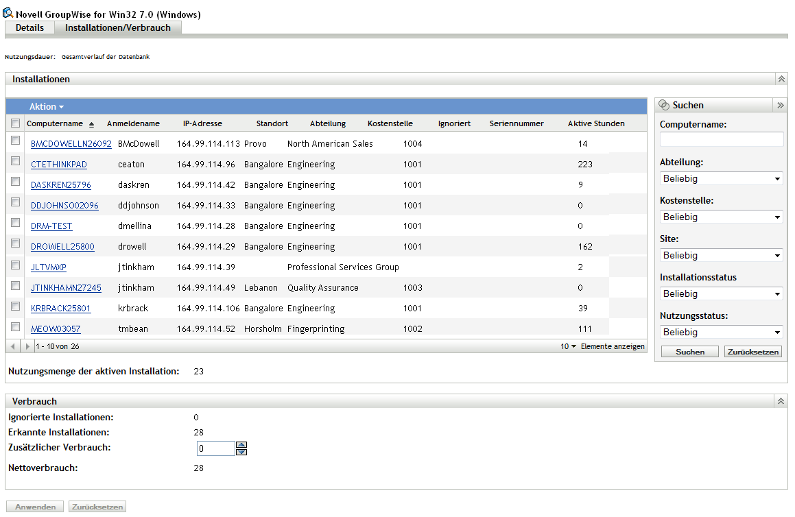 eines ermittelten Produkts wird die Anzahl der Nutzungsstunden für jede Installation angezeigt.