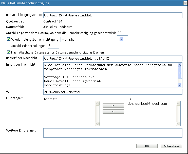 Betreff der Nachricht: Der standardmäßige Betreff der Nachricht enthält den Quellvertrag und das Datumsfeld. Geben Sie einen anderen Betreff an, falls gewünscht.