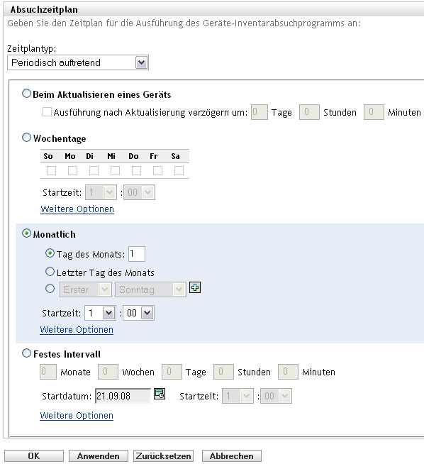 Geben Sie an, ob der Absuchvorgang bei der Aktualisierung eines Geräts, an bestimmten Wochentagen, monatlich oder in festen Intervallen ausgeführt werden soll.