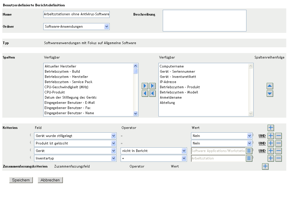 Im ZENworks-Kontrollzentrum können Sie benutzerdefinierte Berichte erstellen und ausführen, mit deren Hilfe Sie das Inventar Ihrer Verwaltungszone analysieren können. In folgenden Abschnitten finden Sie weitere Informationen: