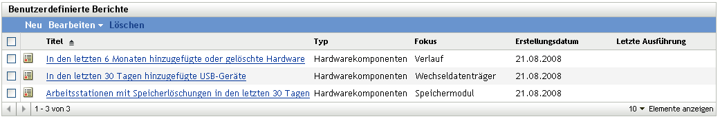 Berichte, die gemäß einem Zeitplan ausgeführt werden, sind in einer Datenbank gespeichert. Diese Berichte können entweder nach Titel oder Datum geordnet angezeigt werden. Informationen zum Planen von Berichten finden Sie unter Abschnitt 8.2.4, Planen eines benutzerdefinierten Berichts und Senden von Benachrichtigungen.