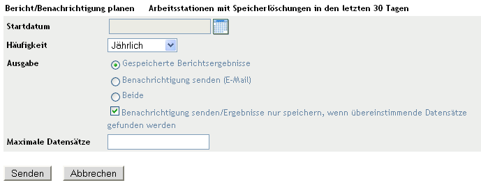 Ausgabe: Geben Sie an, ob der Bericht gespeichert werden soll, eine E-Mail-Benachrichtigung gesendet werden soll, wenn der Bericht zur Verfügung steht, oder beides. Sie können auch angeben, dass die Ergebnisse nur dann gespeichert bzw. eine Benachrichtigung nur dann gesendet werden soll, wenn übereinstimmende Datensätze gefunden werden. Informationen zum Konfigurieren von E-Mail-Adressen finden Sie unter Abschnitt 8.2.5, Konfigurieren von E-Mail-Adressen.