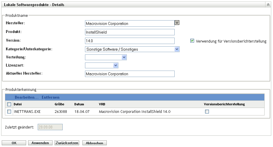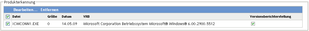 Auf der Seite „Details zu lokalen Softwareprodukten“ werden Details zu den lokalen Softwareprodukten und den zu deren Erkennung verwendeten Dateien angezeigt. Hier können Sie die Produktinformationen oder die Daten des Version Resource Block (VRB) für die Erkennungsdateien bearbeiten. Wenn die mit dem Produkt verknüpfte Datei keine Informationen zum Versionserkennungsblock (VRB) enthält, wird in dem Feld „Namenlos“ angezeigt.