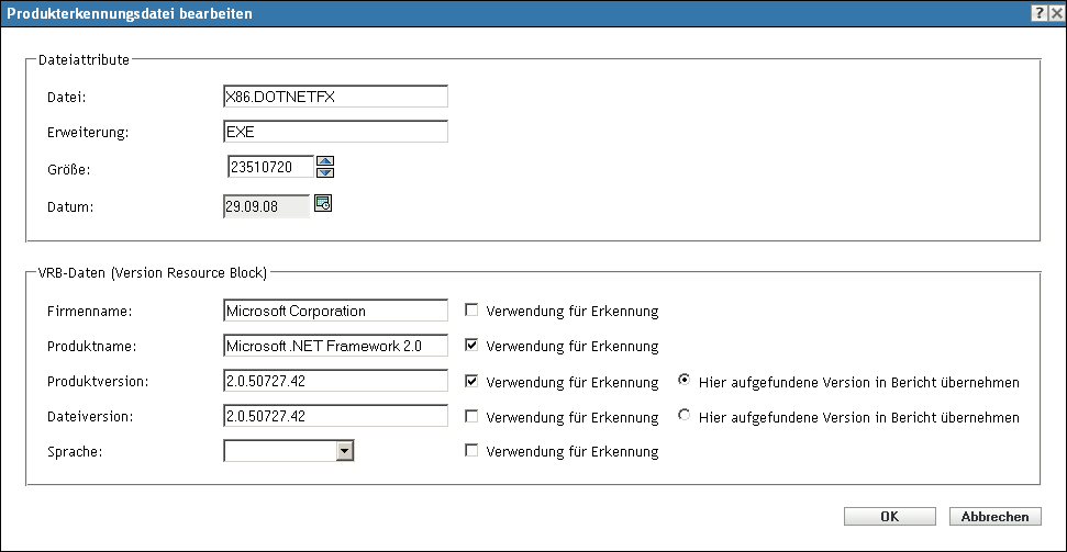 Produktversion: Die Version des Produkts. Wenn diese Daten Teil der Erkennungskriterien sein sollen, wählen Sie . Wenn für die Erkennung anstelle der Dateiversion die Produktversion verwendet werden soll, wählen Sie .