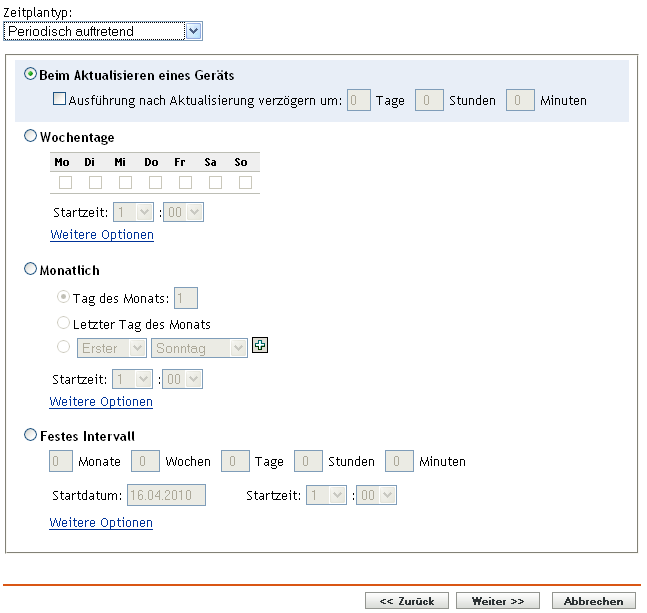 Auf dieser Seite können Sie die folgenden Optionen für eine periodisch auftretende Bereitstellung festlegen: