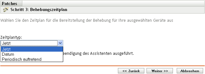 Als erstes müssen Sie für den Behebungszeitplan den Zeitplantyp auswählen. Patch Management bietet Ihnen drei Zeitplantypen, um festzulegen, wann die Patches auf das Zielgerät angewendet werden: