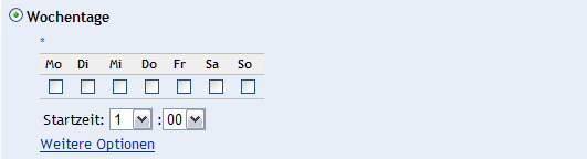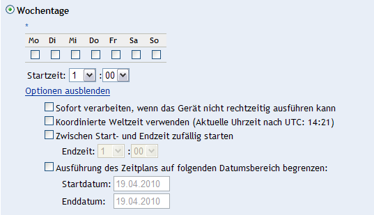 Um den Bereitstellungstag festzulegen, wählen Sie die Schaltfläche aus, markieren Sie den gewünschten Wochentag und legen Sie anschließend die Startzeit der Bereitstellung fest. Durch Klicken auf den Link werden zusätzliche Bereitstellungsoptionen angezeigt (siehe folgende Abbildung): Durch Klicken auf den Link werden die zusätzlichen Bereitstellungsoptionen ausgeblendet und nur die standardmäßigen Bereitstellungsoptionen angezeigt:
