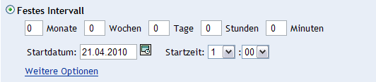Diese Option ermöglicht Ihnen die Planung einer periodisch auftretenden Bereitstellung, die nach einer festen Dauer regelmäßig ausgeführt wird. Wie nachfolgend gezeigt, können Sie die Anzahl der Monate, Wochen, Tage, Stunden und Minuten des Intervalls sowie das Startdatum für den Bereitstellungszeitplan auswählen: