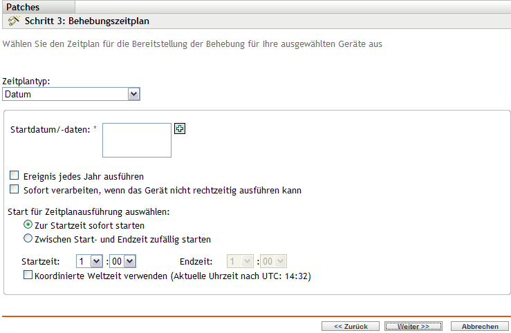 Auf der Seite „Behebungszeitplan“ können Sie angeben, wann ein Patch angewendet und auf den ausgewählten Geräten bereitgestellt wird. Das Festlegen verschiedener Bereitstellungsoptionen für den ausgewählten Patch ist der dritte Schritt beim Planen einer Bereitstellung für einen ausgewählten Patch.
