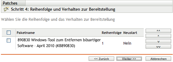 Mithilfe der Seite „Reihenfolge und Verhalten zur Bereitstellung“ des Assistenten zum Bereitstellen von Behebungen können Sie die Reihenfolge und das Verhalten der einzelnen Bereitstellungs-Zeitpläne festlegen. Das Festlegen der Reihenfolge und des Verhaltens der Bereitstellung für den ausgewählten Patch ist der vierte Schritt beim Planen einer Bereitstellung für einen ausgewählten Patch.