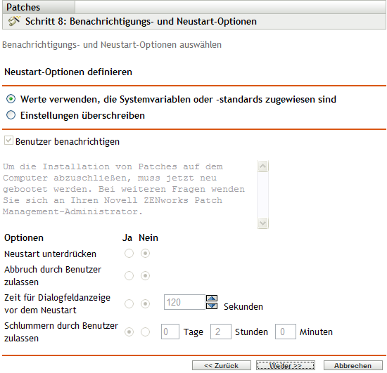 Abbruch durch Benutzer zulassen: Erlaubt es dem Benutzer, den Neustart abzubrechen.