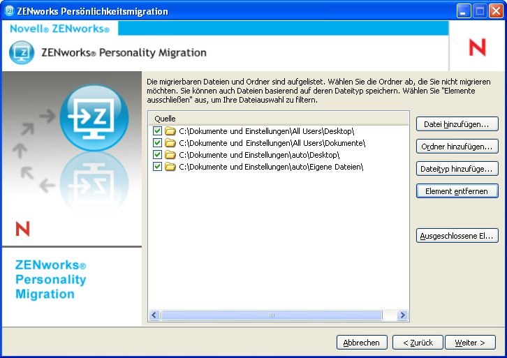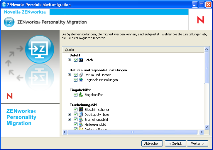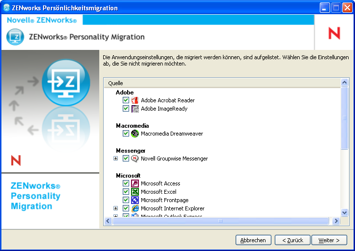 Schließen Sie die Anwendungen, deren Einstellungen migriert werden sollen. (Sie werden auch aufgefordert, alle offenen Anwendungen zu schließen, wenn Sie ZENworks Personality Migration starten.)