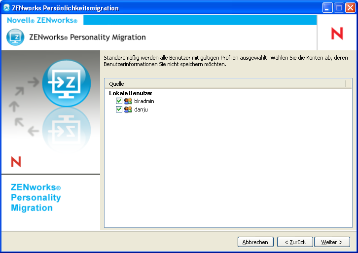 Heben Sie die Auswahl für die Benutzerkonten auf, deren Einstellungen nicht migriert werden sollen.