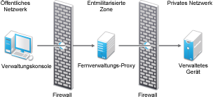 Der Proxy muss auf einem Gerät in einer demilitarisierten Zone (DMZ) installiert werden. Das Gerät, auf dem Sie den Proxy installieren, sollte über das öffentliche Netzwerk, in dem sich die Verwaltungskonsole befindet, zugänglich sein und es sollte auf Geräte in einem privaten Netzwerk zugreifen können. Informationen zur Installation des Fernverwaltungs-Proxys erhalten Sie unter Abschnitt 2.10, Installieren eines Fernverwaltungs-Proxys.