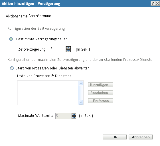 Legen Sie fest, wie lange vor Ausführung der nächsten Aktion im Aktionssatz höchstens auf das Starten des Prozesses oder Diensts gewartet werden soll. Wenn der Prozess oder Dienst nicht innerhalb der angegebenen Zeitspanne gestartet wird, wird die nächste Aktion ausgeführt.