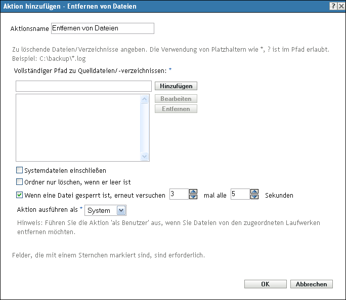 Im Dialogfeld „Aktion - Entfernen von Dateien“ können Sie Dateien oder Verzeichnisse angeben, die vom Gerät entfernt werden sollen.