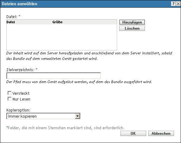Im Dialogfeld „Dateien auswählen“ können Sie die zu kopierenden Dateien auswählen, ein Ziel- und Quellverzeichnis angeben, festlegen, ob die Dateien nach dem Kopieren auf das Gerät verborgen oder schreibgeschützt sind, und eine Kopieroption angeben. Sie können mithilfe dieser Seite auch die Novell File Upload-Erweiterung installieren, die zuerst installiert werden muss, um Dateien zu finden und hochladen zu können.