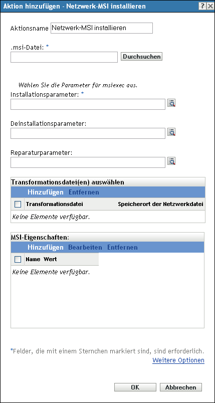 Im Dialogfeld „Aktion - Netzwerk-MSI installieren“ können Sie den Speicherort der MSI-Datei, ihre Installations-, Deinstallations- und Reparatur-Parameter, Transformationsdatei und die Sicherheitsstufe für ausführbare Dateien angeben.