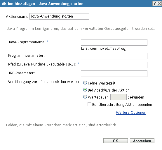 Im Dialogfeld „Aktion - Java-Anwendung starten“ können Sie ein Java*-Programm konfigurieren, das auf dem verwalteten Gerät ausgeführt werden soll.