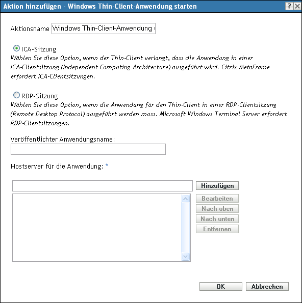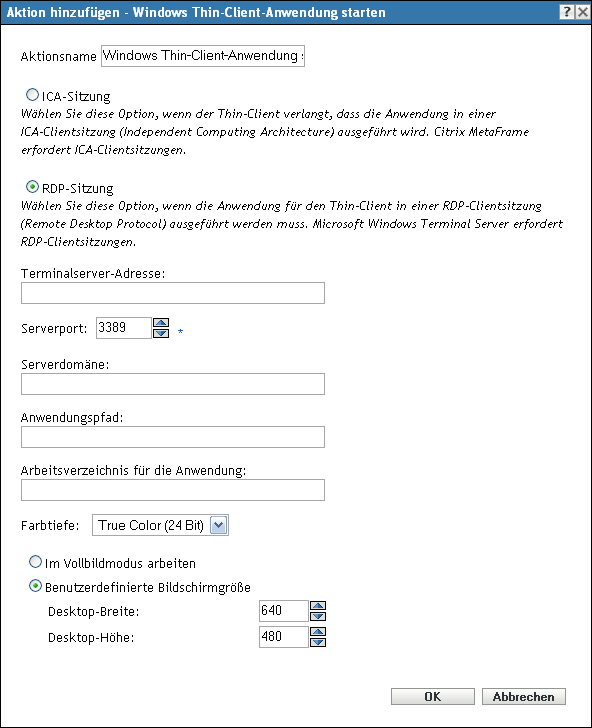 Im Dialogfeld „Aktion - Windows Thin-Client-Anwendung starten“ können Sie eine zu startende ICA (Independent Computing Architecture)- oder RDP (Remote Desktop Protocol)- Clientsitzung angeben und die passenden Einstellungen konfigurieren.