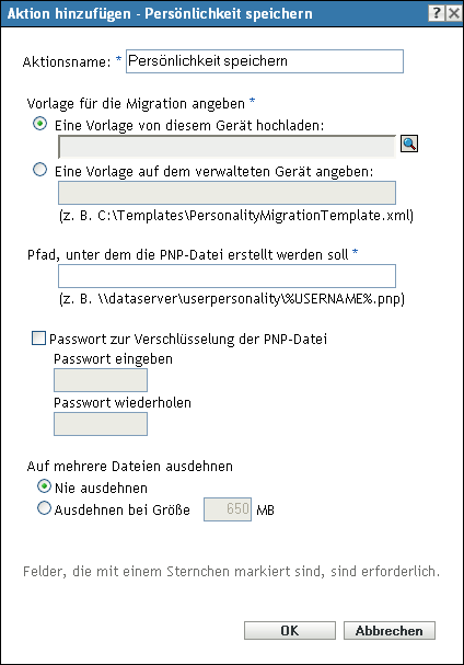 Eine Vorlage auf dem verwalteten Gerät angeben Wählen Sie diese Option aus, um den Pfad der Datei mit der Persönlichkeitsmigrations-Schablone auf dem verwalteten Gerät anzugeben. Sie können auch den UNC-Pfad der Datei angeben.