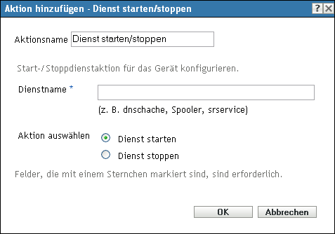 Im Dialogfeld „Aktion - Dienst starten/stoppen“ können Sie den Dienst angeben, der starten oder stoppen soll.