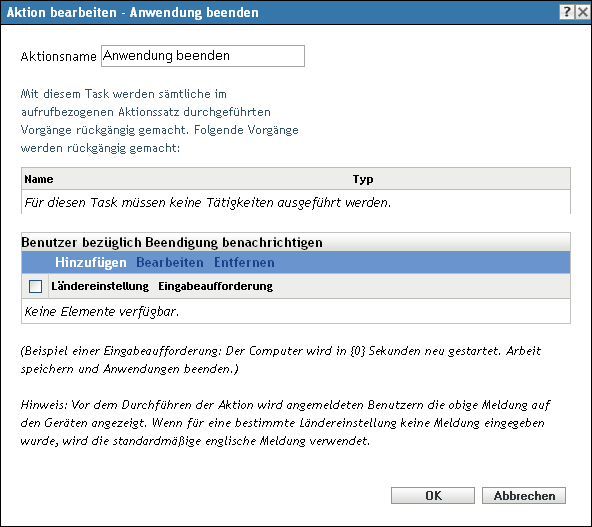 Im Dialogfeld „Aktion - Anwendung beenden“ können Sie alle Vorgänge rückgängig machen, die im aufrufbezogenen Aktionssatz durchgeführt wurden. Sie können eine Eingabeaufforderung konfigurieren, um Benutzer über die Beendigung zu benachrichtigen.