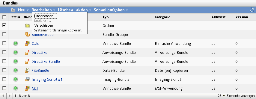 Verwenden Sie die Dropdown-Liste auf der Seite „Bundles“, um ein bestehendes Objekt zu bearbeiten. Um auf die Dropdown-Liste zuzugreifen, müssen Sie ein Objekt wählen, indem Sie das Kontrollkästchen neben dem Objektnamen in der Liste aktivieren.