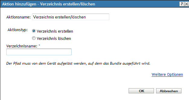 Verzeichnisname: Geben Sie den vollständigen Pfad des Verzeichnisses an, das auf dem verwalteten Gerät erstellt oder gelöscht werden soll. Der Pfad muss von dem Gerät aufgelöst werden, auf dem das Bundle ausgeführt wird.
