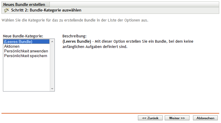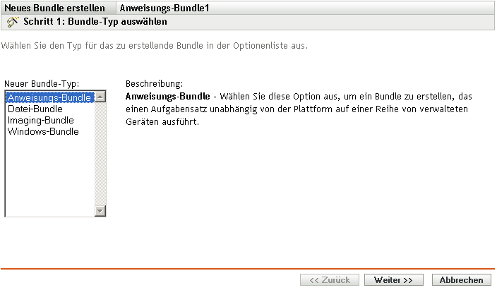 Beschreibung: Geben Sie eine kurze Beschreibung des Bundle-Inhalts an. Diese Beschreibung wird im ZENworks-Kontrollzentrum und im ZENworks Adaptive Agent angezeigt.