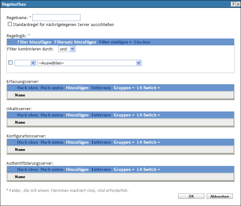 Der Name wird in der Liste „Regeln für nächstgelegenen Server“ im ZENworks-Kontrollzentrum angezeigt. Klicken Sie für den Zugriff auf diese Liste im linken Fenster auf , klicken Sie auf die Registerkarte und dann auf die Kontrollleiste , um sie zu öffnen. Klicken Sie auf den Abschnitt , um ihn zu öffnen, und klicken Sie anschließend auf . Alle definierten Regeln für die aktuelle Ebene werden dort angezeigt.