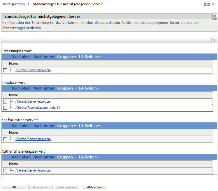 Standardmäßig fungieren alle ZENworks-Server als Authentifizierungs-, Erfassungs-, Inhalts- und Konfigurationsserver und werden in den entsprechenden Listen angezeigt. Außerdem werden alle Geräte, die mit der Inhalts- oder Imaging-Rolle definiert wurden, auch in der Liste Inhaltsserver angezeigt, alle Geräte, die mit der Erfassungsrolle definiert wurden, auch in der Liste Erfassungsserver und alle Geräte, die mit der Authentifizierungsrolle definiert wurden, auch in der Liste Authentifizierungsserver.
