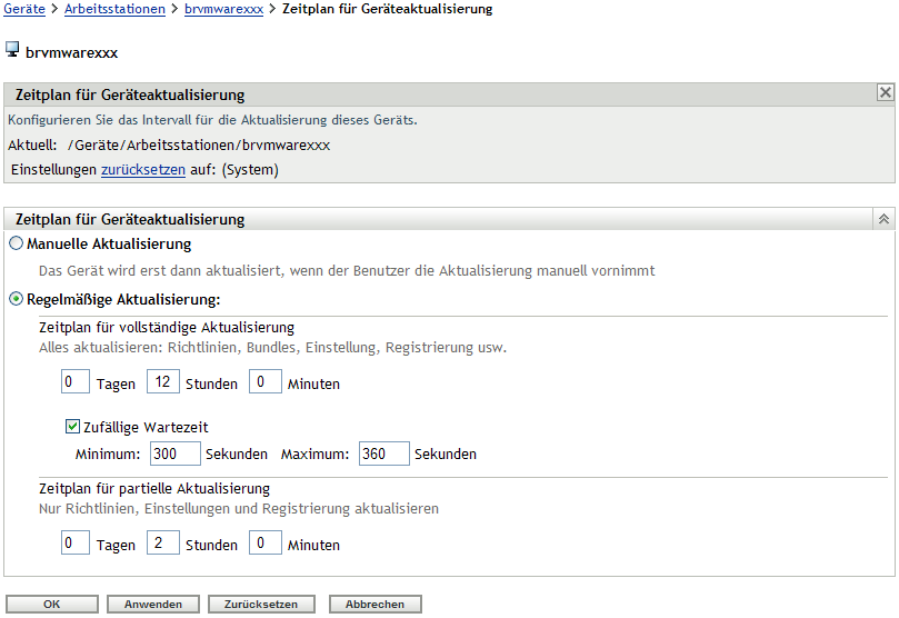 Zeitplan für partielle Aktualisierung: Legt fest, wie oft ein Gerät mit dem ZENworks-Server Kontakt aufnimmt, um seine Richtlinien-, Konfigurations- und Registrierungsinformationen zu aktualisieren. Bundle-Informationen werden nicht aktualisiert.