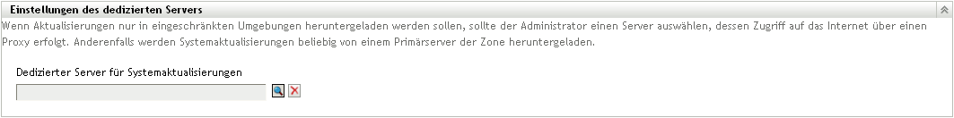 Standardmäßig kann jeder Primärserver der Verwaltungszone in beliebiger Auswahl Aktualisierungen herunterladen. Sie können für das Herunterladen der Aktualisierungen jedoch auch einen dedizierten ZENworks-Server festlegen. Der ausgewählte Server muss direkt oder über einen Proxyserver Zugang zum Internet haben.