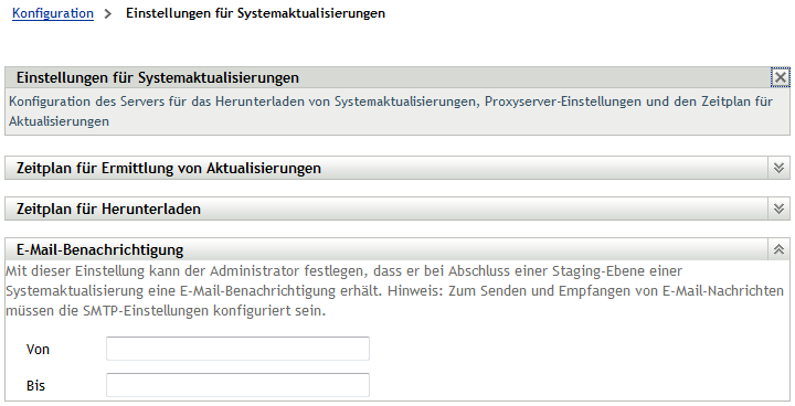 Sie können angeben, wie häufig die Ermittlung von Aktualisierungen erfolgen soll. Wenn Sie einen Zeitplan angeben, werden die Informationen zu den verfügbaren Aktualisierungen automatisch von Novell auf die Kontrollleiste „Verfügbare Systemaktualisierungen“ der Registerkarte heruntergeladen, sobald die Zeitplanaktion ausgelöst wird. Damit wird nicht der eigentliche Aktualisierungsinhalt heruntergeladen. Der Download-Zeitplan kann in der Kontrollleiste „Zeitplan für Herunterladen“ festgelegt werden (siehe Zeitplan für Herunterladen).