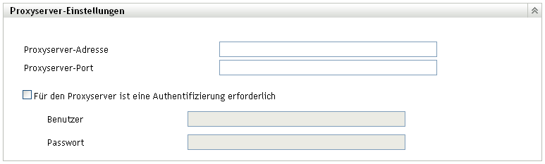 Für den Proxyserver ist eine Authentifizierung erforderlich: Wenn Sie dieses Kontrollkästchen markieren, werden die Felder und editierbar. Wenn Authentifizierung erforderlich ist, markieren Sie dieses Kontrollkästchen und geben Sie Benutzername und Passwort für den Zugriff auf den Proxyserver ein.